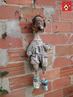 La casa también tiene detalles curiosos como una moto Derbi Variant en su interior, muchos calendarios, fotos antiguas de la familia, una viejas neveras, una antigua radio, cajas de fruta de plástico a mansalva, instalacioneseléctricas dignas del mas chapuzero del barrio, un taller chapurreao lleno de trastos y un curioso espantapájaros que me recuerda al Macario. Un momento... ¿No es Macario?
